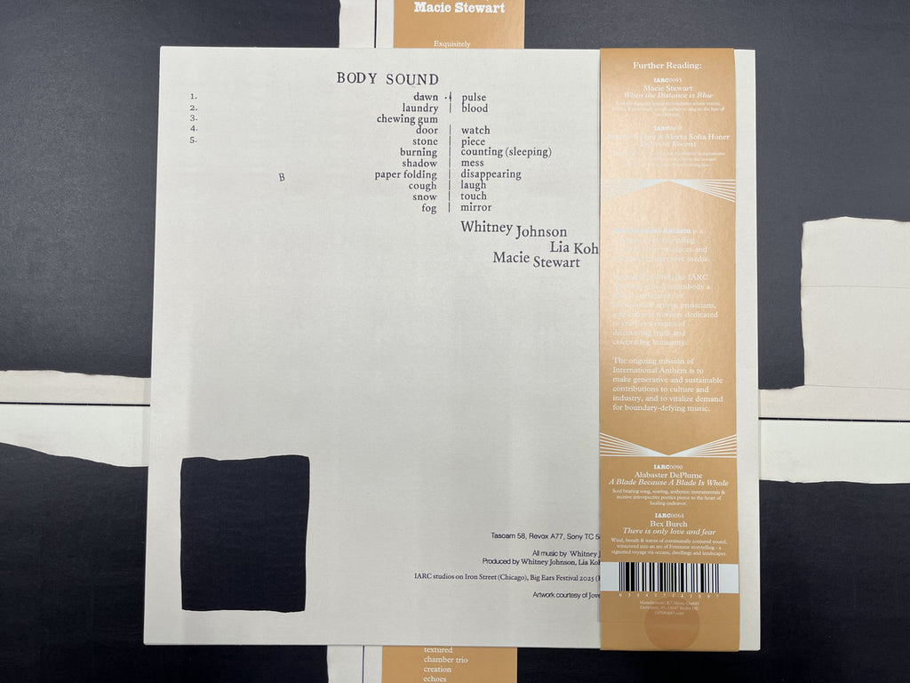 That trust, it seems, was already there. In addition to the communal criss-cross inherent in sharing their Chicago home base, the trio worked with Vettraino on Stewart’s 2025 solo effort When the Distance Is Blue. It was her debut on International Anthem but far from her first appearance in the label’s catalog as a player. Ditto for Kohl and Johnson, whose collaboration and friendship with the label goes back years. Taken as a whole, we could argue that this most recent collaboration, the tape-manipulated fried beauty documented on BODY SOUND, has been a long time coming.