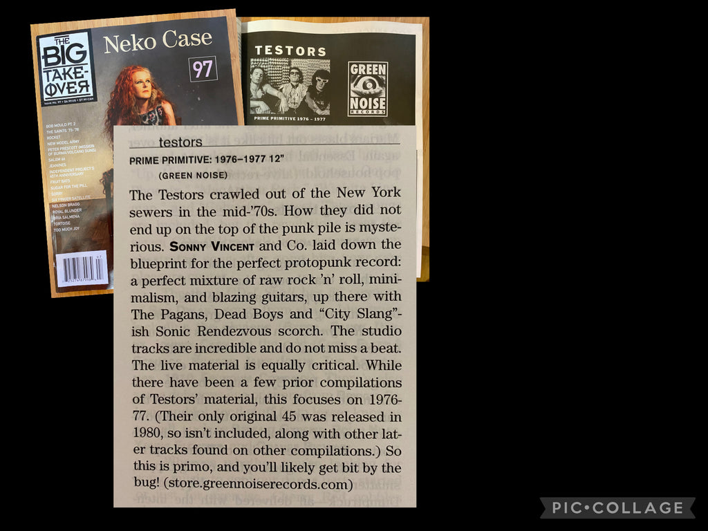 In 1977, America was listening to a few albums on repeat by bands such as Foreigner, Styx, Eagles, Boston, Meatloaf, Bee Gees, Fleetwood Mac, Jackson Browne, Kansas, Clapton, Steely Dan, and Peter Frampton...but don’t let that fool you into thinking it was all a bunch of bullshit. 1977 was of course an amazing year, offered many seminal records that defined the era and created the future, two from Ramones, debut albums from Suicide, Heartbreakers, Richard Hell & The Voidoids, Talking Heads, Television, Blondie (actually late in 1976), and that’s just NYC! Elsewhere, we got many key second albums...EPs and singles from Cleveland to London...multiple P-Funk albums...AC/DC...Thin Lizzy Bad Reputation...and debut albums by The Clash, The Damned, Sex Pistols, The Boys, The Stranglers, Wire, Buzzcocks, Ian Dury, Cheap Trick, Elvis Costello, the Dead Boys, The Real Kids, The Saints, Radio Birdman… We didn’t get The Testors debut, but we sure should have! This is the album that could've been, should've been, here 'tis. Sonny Vincent had been playing shows and recording tracks in NYC since the beginning of the 1970s, started recording and performing as Testors in 1976, one live and 3 studio tracks from that year included on this release, the others here from 1977. It was just one year, but it was an amazing one, so being one of the best albums of 1977 makes it one of the best albums of all time. And this one stands next to any of them. You give me my 20 albums to take to my island, this Testors album is in the crate. There's nothing else like it so nothing could replace it. If you hold up either of those two Ramones albums, and ask if this is the greatest album of all time, I’m going to say YES! If you hold up Thin Lizzy – Bad Reputation (my first new-release 8-track purchase as a kid) and ask if it’s the greatest album of all time, I’m going to say YES! And if you hold up this Testors album and ask if this is the greatest album ever recorded, I’m saying YES! Sometimes I say that, but when I return to the record, I might downgrade it just slightly. But not with this one. The more I listen, the more I love it. It is the greatest album ever recorded. -- winch (green noise)
