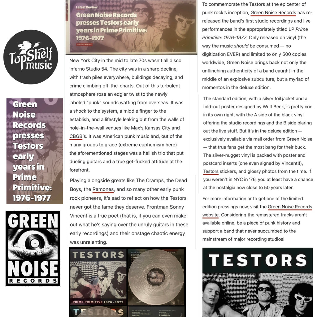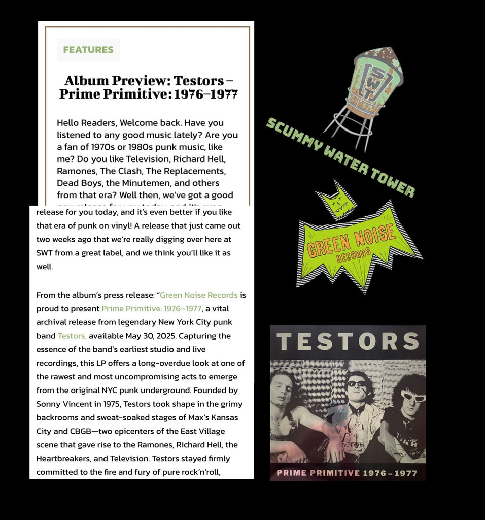 Green Noise Records is proud to present Prime Primitive: 1976–1977 from legendary New York City punk band Testors. Capturing the band’s earliest studio and live recordings, this LP offers a look at one of the rawest and most uncompromising acts to emerge from the original NYC punk underground. Founded by Sonny Vincent in 1975, Testors took shape in the grimy backrooms and sweat-soaked stages of Max’s Kansas City and CBGB—two epicenters of the East Village scene that gave rise to the Ramones, Richard Hell, the Heartbreakers, and Television. Testors stayed firmly committed to the fire and fury of pure rock’n’roll, leaving behind a trail of scorched earth and unforgettable shows—including a tour with the Dead Boys that spread their chaotic energy nationwide. Far from lacking recorded material, Testors had a wealth of songs and studio sessions, but due to their fiery temperament and their desire to burn every bridge in sight they simply rejected the compromises demanded by record companies. Their often violent, stripped-down sound helped shape the American punk blueprint that thousands of bands would follow.