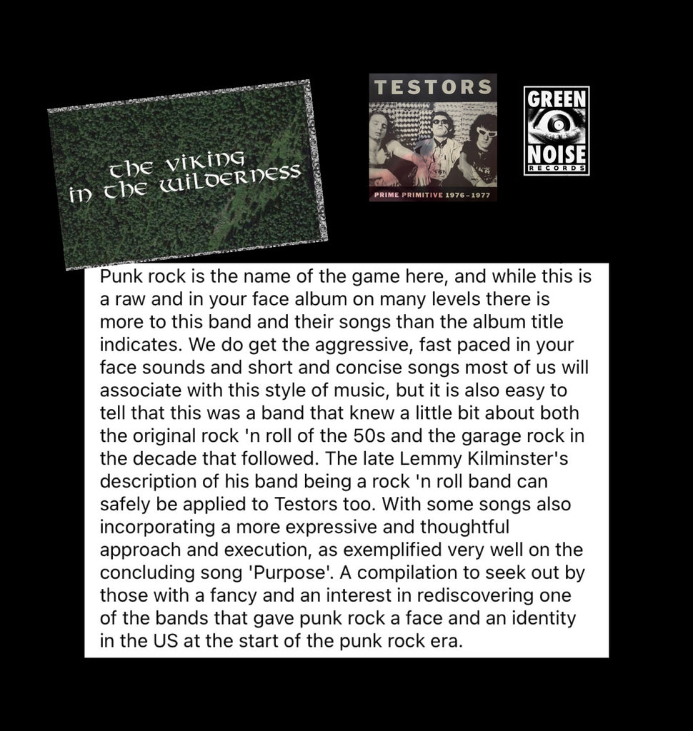 In 1977, America was listening to a few albums on repeat by bands such as Foreigner, Styx, Eagles, Boston, Meatloaf, Bee Gees, Fleetwood Mac, Jackson Browne, Kansas, Clapton, Steely Dan, and Peter Frampton...but don’t let that fool you into thinking it was all a bunch of bullshit. 1977 was of course an amazing year, offered many seminal records that defined the era and created the future, two from Ramones, debut albums from Suicide, Heartbreakers, Richard Hell & The Voidoids, Talking Heads, Television, Blondie (actually late in 1976), and that’s just NYC! Elsewhere, we got many key second albums...EPs and singles from Cleveland to London...multiple P-Funk albums...AC/DC...Thin Lizzy Bad Reputation...and debut albums by The Clash, The Damned, Sex Pistols, The Boys, The Stranglers, Wire, Buzzcocks, Ian Dury, Cheap Trick, Elvis Costello, the Dead Boys, The Real Kids, The Saints, Radio Birdman… We didn’t get The Testors debut, but we sure should have! This is the album that could've been, should've been, here 'tis. Sonny Vincent had been playing shows and recording tracks in NYC since the beginning of the 1970s, started recording and performing as Testors in 1976, one live and 3 studio tracks from that year included on this release, the others here from 1977. It was just one year, but it was an amazing one, so being one of the best albums of 1977 makes it one of the best albums of all time. And this one stands next to any of them. You give me my 20 albums to take to my island, this Testors album is in the crate. There's nothing else like it so nothing could replace it. If you hold up either of those two Ramones albums, and ask if this is the greatest album of all time, I’m going to say YES! If you hold up Thin Lizzy – Bad Reputation (my first new-release 8-track purchase as a kid) and ask if it’s the greatest album of all time, I’m going to say YES! And if you hold up this Testors album and ask if this is the greatest album ever recorded, I’m saying YES! Sometimes I say that, but when I return to the record, I might downgrade it just slightly. But not with this one. The more I listen, the more I love it. It is the greatest album ever recorded. -- winch (green noise)