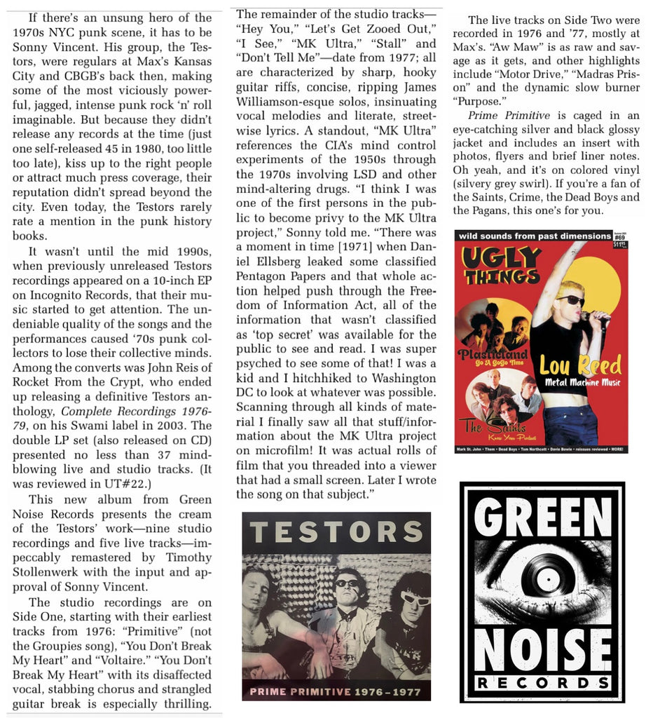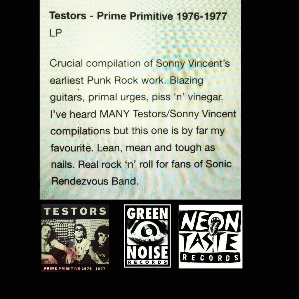 Green Noise is so proud to offer this record, all songs written by Sonny Vincent, selected and sequenced by Sonny Vincent (Testors) and winch (green noise), one side studio, one live...two guitars, drum, throat--that's it, all that Testors needed to build the raw punk sound and rip you apart...the sounds that inspired and influenced 3000+ punk bands...all songs newly remastered for maximum punch and loudness...Testors in the beginning (1976 - 1977), punk poetry set to sound, selections distilled down to the absolutely essential early recordings: PRIME PRIMITIVE. -- winch