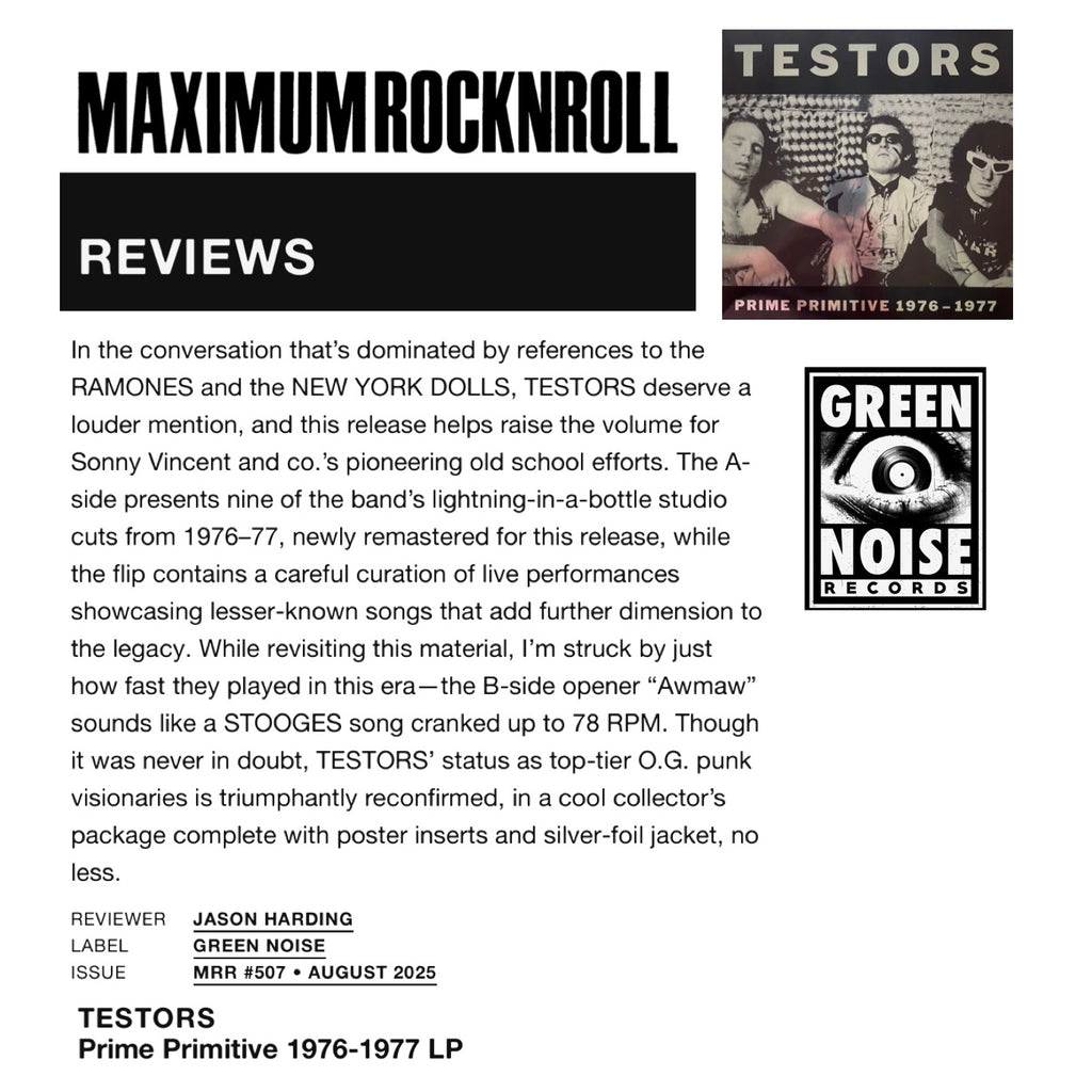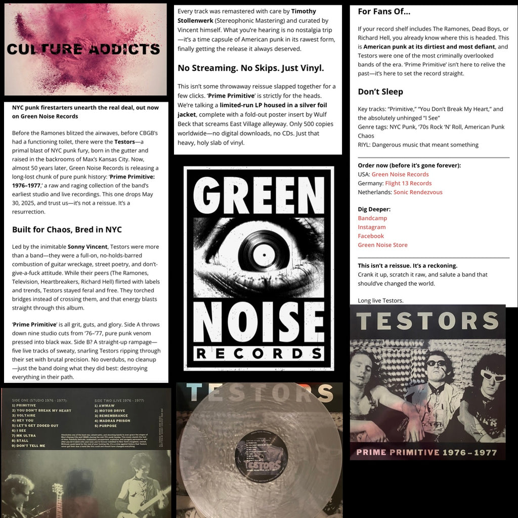 Prime Primitive: 1976–1977 is not a lost album. It's a carefully curated collection, assembled by Green Noise Records, restoring a crucial piece of punk history and reaffirming what those who were there already knew: Testors weren’t just another band in the scene—they were one of its most dangerous and essential voices. This isn’t nostalgia. It’s recognition. And it’s long overdue.