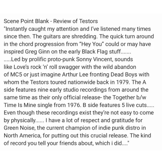Testors erupted on the New York scene at the epicenter of the punk rock explosion. Absolutely one of the best raw, catastrophic, and shocking bands to ever grace the stages of Max's Kansas City and CBGB’s during the mid-70's punk heyday, their incendiary sound consisted of dueling guitar noise and Sonny Vincent's street poetry. Painfully delicate, unabashed, unrepentant, explosive, and savagely persuasive. Their earliest recordings are considerably tougher, louder and more desperate than any other music made at that time (or since) and after you let it latch onto your soul, you're forever indebted to New York's toughest, rawest, REALest punk band for the rest of your fucking life. It’s a crime against history that the Testors never got their due: a band like this could and should have changed everything.